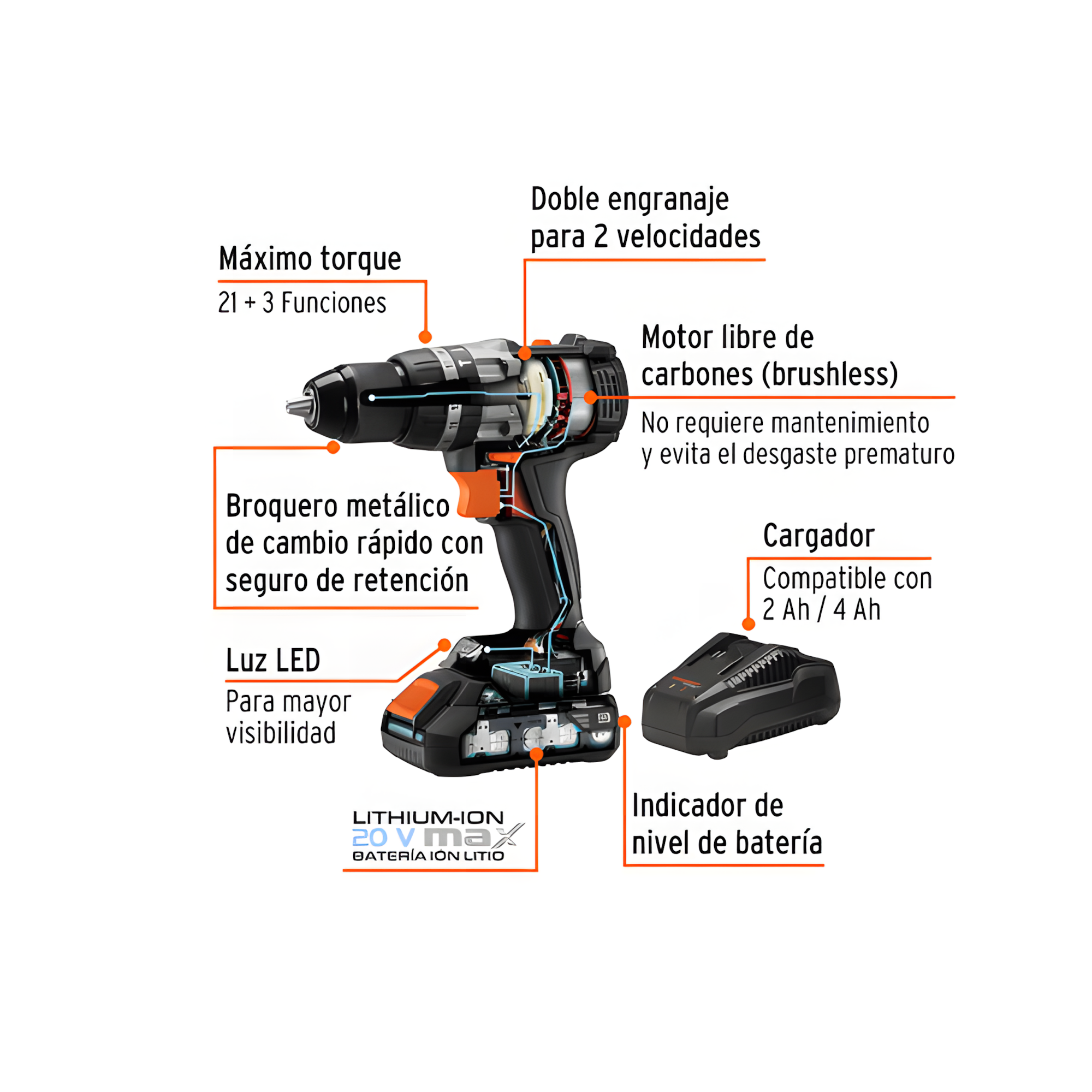 Motor Brushless: Máxima potencia, mayor duración de batería y libre de mantenimiento.